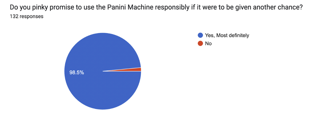 However, as Chef Maws explained, safety hazards have posed various issues in the past. But students in 2026 seem to feel an increased sense of responsibility. Out of 132 panini lovers’ responses, 98.5% pinky promised to use the Panini Machine responsibly should the powers that be approve it. With this promise not to endanger the livelihood of Belmont Hill Students and Staff, we issue this heartfelt plea. Give us another chance!